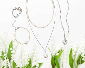 ヴァンドームブティックの2024年春は、可憐な“すずらん”をイメージした新作パールアクセサリーを提案。2本セットのネックレスでは、自然の形をそのまま活かしたバロックパールで表現したすずらんの花と、淡水パールを連ねたネックレスのレイヤードを楽しむことができる。