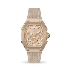 重厚感がありながらも軽量なアルミ製ケースは、スチール製のネジでセット。文字盤には、スケルトンの針や日付、曜日、24時間計のサブダイアルを配しているほか、日本製の多機能ムーブメント「Miyota 6P29」を搭載した。またストラップには肌なじみのいい柔らかなシリコンラバーを採用し、快適な着け心地を実現している。