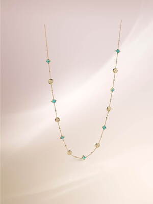 「アマゾナイト」の魅力は、ミントを思わせるブルーグリーンの色味。イエローゴールドのフレームと組み合わさることで、「アマゾナイト」の豊かな色味が一段と強調されている。
