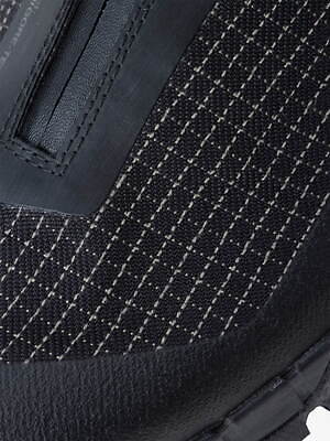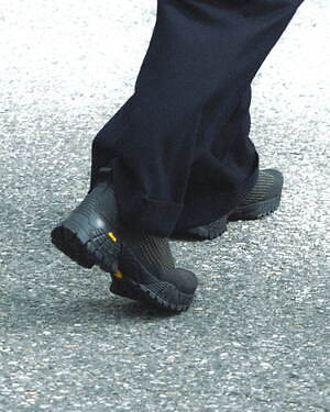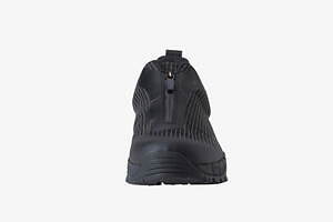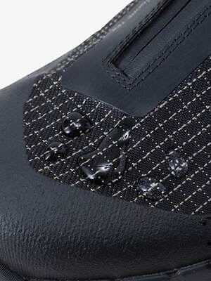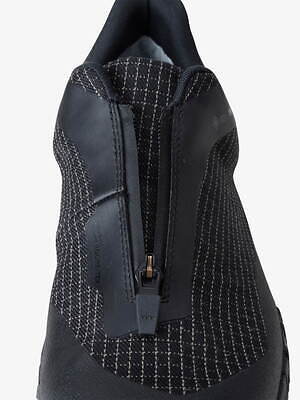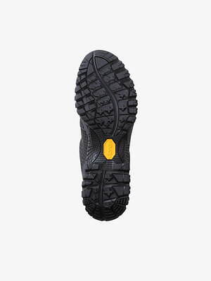 また、フロントの止水ファスナーにより、着脱もスムーズに。アウトソールには、ギザギザとした無骨なデザインと高いグリップ力を持つヴィブラム メガグリップ(Vibram MEGAGRIP)を使用しているので、安定感のある歩行をサポートしてくれる。なおアッパーからソールに至るまで、ブラックカラーで統一しているのもポイントだ。