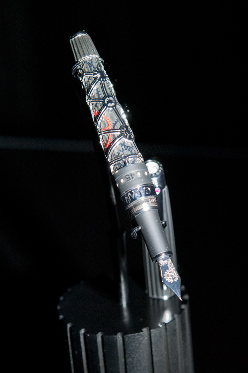 キャップには572個のバゲットカット・ダイヤモンドを使用。44の違ったサイズのダイヤモンドが、手作業と特殊な堀り留め技術でセットされている。そしてクリップにはブリリアンカットのダイヤモンド(0.18カラット)が一粒施され輝きを放つ。ボディは繊細な2つのケージで作られている。外部ケージは時計の歯車を支えるブリッジをモチーフにし、170個のエメラルドカット・ダイヤモンドと12個のブリリアントカット・ダイヤモンドが施されている。時計の歯車のデザインの内部ケージのリング部分は、96個のダイヤモンドが敷き詰められ、88個のバゲットカット・ホワイトダイヤモンドの中に、時計の15分間隔でブラックダイヤモンドがセット。