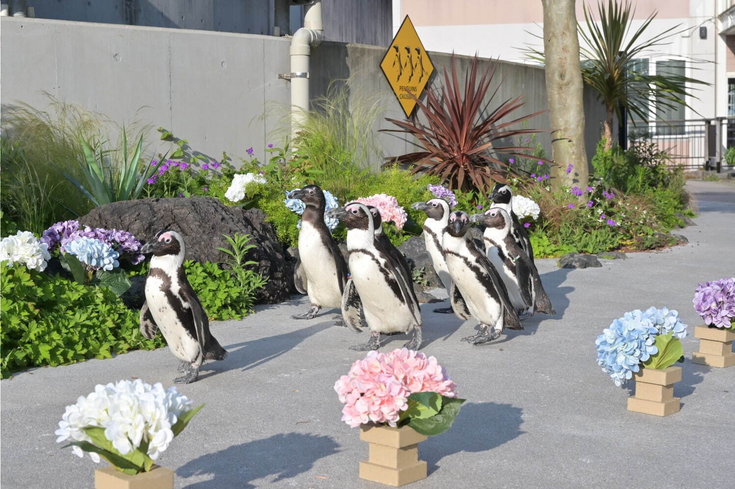 八景島シーパラダイス内の水族館で開催される限定イベントも要チェックだ。水族館の「ふれあいラグーン」では、よちよちと歩く姿が可愛らしいケープペンギンたちが、あじさいをはじめとする花々に彩られた道を行進するパレードを行う。