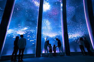 また「アクアミュージアム」の大水槽では、国内最多飼育数となる5万尾のイワシが音楽や照明に合わせ乱舞する「スーパーイワシイリュージョン」を限定バージョンで開催。大水槽全体が梅雨やあじさいなどをイメージした青色などの淡いライティングとなり、降りそそぐ雨のようにイワシがキラキラと輝くパフォーマンスを眺めることができる。