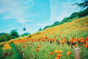 花束作りと合わせて楽しみたいのは、体験スペースの目の前に広がるカモミールとポットマリーゴールドで埋め尽くされる花畑。「風の丘フラワー園」にて、やさしく香るハーブの香りに癒されること間違いなしだ。なおジャーマンカモミールとポットマリゴールドの見頃は、6月上旬までとなっている。