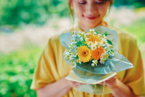 触れると青りんごのような香りがするカモミールや、鮮やかなオレンジ色が目を惹くポットマリーゴールドをメインとして用意。このほかローズマリー、ミントなど3種のハーブを組み合わせて、自分だけのオリジナルブーケを製作できる。