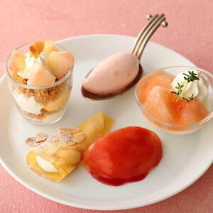 アフタヌーンティースタンドを彩るのは、桃をふんだんに使ったスイーツの数々。こだわりの卵で作るプリンに桃のコンポートを合わせた「白桃のプリン・ア・ラ・モード」、焦がしバター香る自家製クレープにマリネした桃を添えた「ピーチメルバクレープ」、ピーチジュレに白ワインを加えて大人の味わいに仕上げた「白桃のマチェドニア」など、多彩なメニューが用意されている。