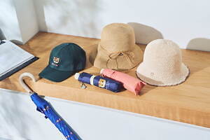 日よけだけでなく天気がすぐれない日にも活躍する傘にも注目。爽やかなブルーの長傘は、パラソル全面にベレー帽を被ったヌネットとエッフェル塔をプリント。ヌネットのワンポイントを配したネイビーの折り畳み傘は、白いハンドルをアクセントに取り入れている。