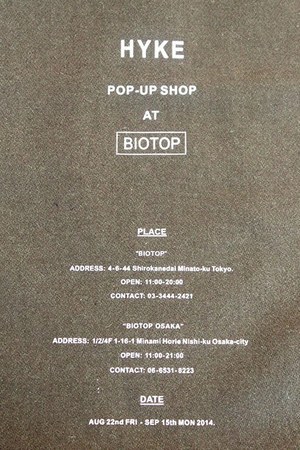 セレクトショップのBIOTOP(ビオトープ)で、2014年8月22日(金)から9月15日(月)までの期間、HYKE(ハイク)の限定ショップがオープン。東京と大阪の2店舗で同時展開される。