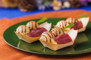 注目スイーツは、まるで“たこ焼き”のような見た目をした「いもくりなんきん欲張り小舟」。濃厚な甘さを持つ焼き芋に、マロンジェラートとかぼちゃジェラートをあわせ、“いも・くり・なんきん”を1度に楽しめる味わいに仕上げた。