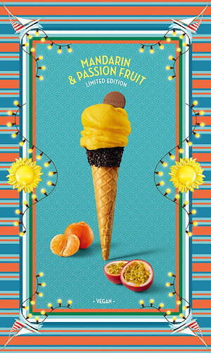 新作ジェラート「マンダリン&パッションフルーツは、みずみずしいマンダリンと“南国の果実”パッションフルーツをコンビネーションした、夏にぴったりのフレーバー。酸味の効いたマンダリンピューレと、ほんのり甘いパッションフルーツが、口の中で爽やかに広がる。“ミルク不使用”のウォーターベースのため、さっぱりとした後味で、暑い夏でも最後までソルベを味わえる。