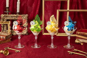 注目は、グリフィンドール、スリザリン、ハッフルパフ、レイブンクローそれぞれの寮をイメージし、カラフルなソースで仕上げたパフェだ。たとえば「グリフィンドール パフェ」は、パンナコッタやバニラとカシスのアイス2種をベースに、ベリーソースをかけている。