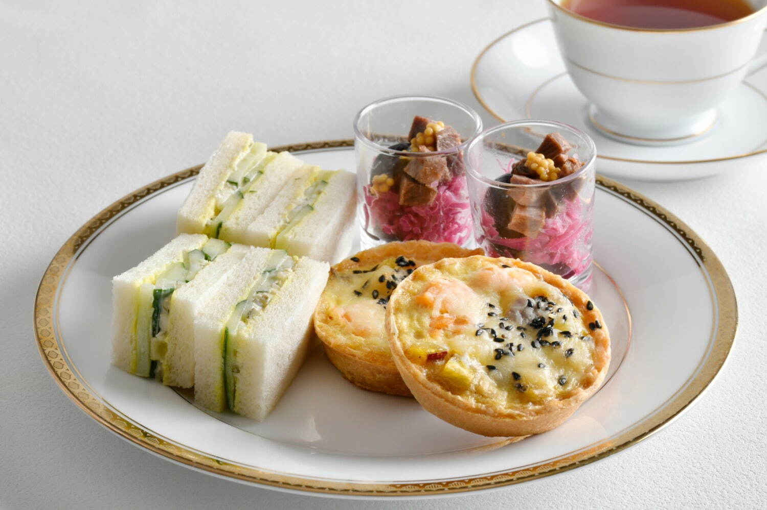 セイボリーにも、秋の味覚をふんだんに使用。さつまいもとサーモンをグラタン風に焼き上げたキッシュをはじめ、赤キャベツとぶどうの紫色マリネ、キューカンバーサンドといった、食べ応え満点のメニューが登場する。