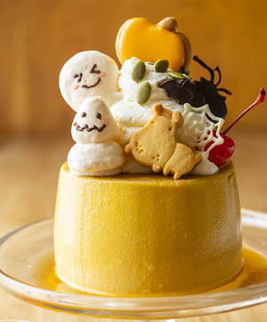 約20人前のジャンボプリンは、ハロウィン仕様になって登場。キュートな表情をしたおばけのメレンゲ、蜘蛛の巣やコウモリのチョコレートを飾った。このほかにも「モンブランプリンパンケーキ」や「モンブラン皿プリン」など秋を楽しむスイーツが勢ぞろいする。