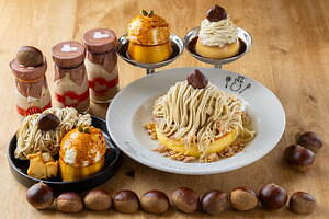 「かぼちゃの皿プリン」は、まるでかぼちゃをそのまま食べているかのようなホクホク感が魅力。ほろ苦いカラメルとのハーモニーを楽しめる。甘栗入りのクリームを使用した「モンブランロールケーキ」とのセットも用意している。