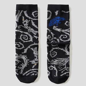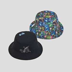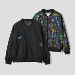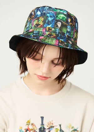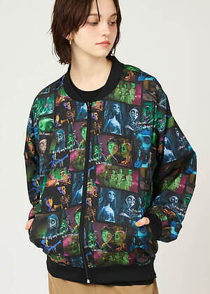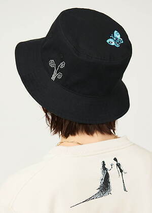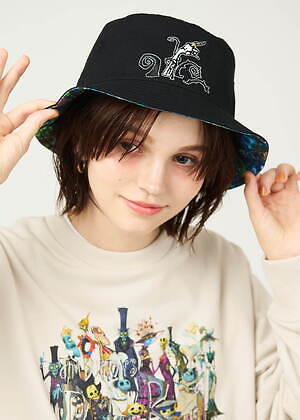 秋口にぴったりのブルゾンは、『ティム・バートンのコープスブライド』の世界観を存分に落とし込んだリバーシブル仕様に。蝶やエミリーの手を刺繍したブラックの面と、死者の世界での名場面をパターンにして連ねた面を楽しめる。また、同じデザインのリバーシブルバケットハットも用意している。
