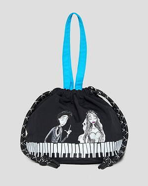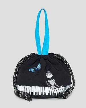 巾着バッグは、ビクターとエミリーがピアノを通して心を通わせるシーンをイメージ。背面には、ビクターの本来の婚約者であるビクトリアの姿と、持ち手のカラーに合わせた青色の蝶を刺繍した。丈夫なナイロン素材なのも嬉しいポイントだ。