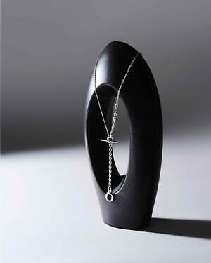 新作ジュエリーは、丸いフォルムと滑らかな着け心地にこだわった「ロンド」シリーズをベースにした、2Wayネックレス。2つのチャームそれぞれにTバーを通すと、Y字型ネックレスとロングネックレスの2パターンが楽しめる。パーツを繋げるチェーン部分は、ボリュームが異なる3種類の楕円型”アズキチェーン”をグラデーションにした、アシンメトリーなデザインだ。素材はあえてコーティングをかけない”ヌードシルバー”を採用し、シルバーそのものの美しさを引き出している。