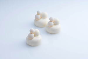 「風雷」は、風神雷神像をモチーフにした、球体がリズミカル連なるシンボル作品「Fu / Rai」が着想源だ。時間の移ろいに合わせて表情を変える「Fu / Rai」の陰影を、トップの球体バニラムースで表現。ケーキは、ホテルオリジナルの紅茶ムースをベースに、オレンジとマンゴーの爽やかなコンフィチュールやシナモンムース、チョコレートガナッシュを重ねている。