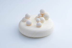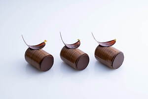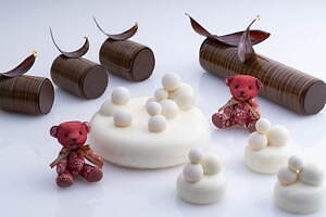 大阪の水脈をモチーフにしたアート「ヴェイン(Vein)」から着想を得たブッシュ・ド・ノエルも見逃せない。キャラメルとパールカラーでグラサージュのラインを描き、水の流れを表しているのが特徴だ。1口頬張ると、華やかなジャスミンの香るチョコレートムースや、酸味の効いたオレンジクレームブリュレ、濃厚なジャンドゥーヤムースのハーモニーを感じられる。