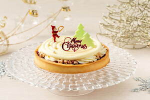 「タルトノエル ポムフランボワーズ」は、切株に雪が降り積もったシーンを連想させるクリスマスタルト。タルト生地に、ピスタチオのチョコレートガナッシュやライスパフ、甘酸っぱいフランボワーズのソースなどを重ね、真っ白なリンゴフレーバーのクリームを“年輪”のように巻いた。
