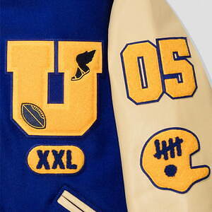 ジャケットは、ブルーのウール生地をベースに袖部分に牛革を使用。襟、袖口、ウエストバンドにはストライプのリブが配され、ボディにはイエローを中心にしたワッペンと刺繍が施されている。