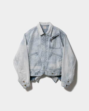 注目は、Leeを代表するジャケット「91-B」と「91-J」の2つを融合させたデニムブルゾン。Leeのワークジャケットの中で初めてフロントファスナーを採用した「91-B」と、鉄道労働者のために作られた「91-J」という異なるルーツを持つ2つのジャケットが、上下逆さまとなって1着に合体。それぞれの歴史を共存させた、新たな価値観をもつブルゾンに仕上がっている。