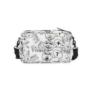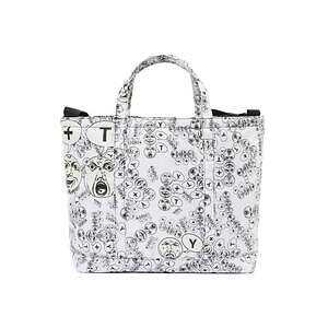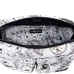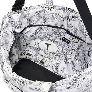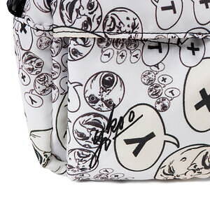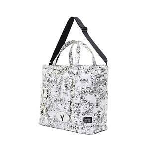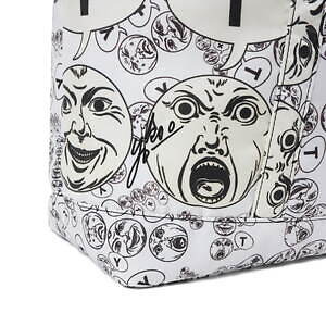 横尾忠則は、画家としてだけでなくグラフィックデザイナーやイラストレーターなど、さまざまな活動で知られる世界的アーティスト。今回のコラボレーションでは、ボンディング加工を施した軽量かつ手触りのいい生地に、横尾忠則のイラストアート「泣き笑い人生」を、1点1点異なる総柄プリントで落とし込んだ。展開する2つのバッグには、横尾忠則のサイン刺繍が施されている。