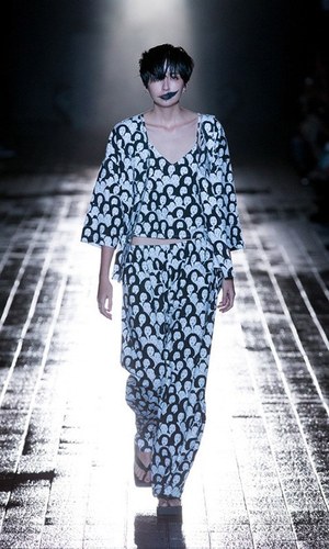 ファーストルックは、デザイナーであるikumi自身が、たくさんの顔がプリントされたセットアップを着て登場。その他、「○□△」といったブランドのトレードマークの形を表現したバッグや、「IKUMI」のアルファベットを羅列を配したワンピースなど、アイコニックなエレメントを大胆にちりばめた。
