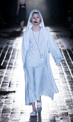 また全体的にラフでクールな装いが目立つが、今シーズンは細いストラップで吊るされたペプラムのキャミソールや、輝くビジューがあしらわれたパイル地のセットアップなど、キュートなスタイルも目を引く。コレクション全体を通して、今季も「白」「黒」の2色を巧みに操った、オリジナルのスタイルを披露した。