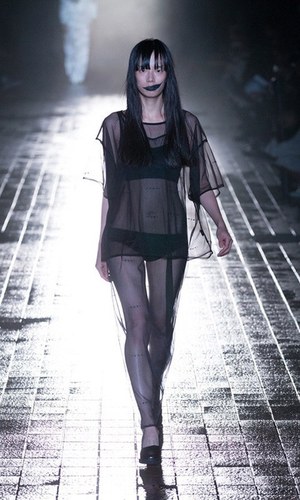 まだショーが始まらない暗いランウェイには水が撒かれ、何かが起こりそうな予感を漂わせる。次々と会場へ足を運ぶ観客の胸も高鳴る中、静かな会場の正面に「i」の文字を象ったライトが光り、ショーが幕を上げた。