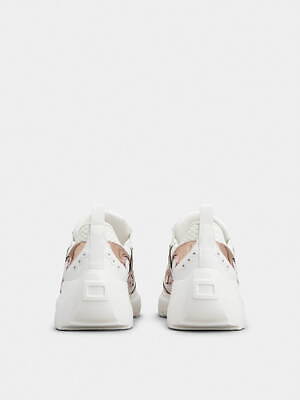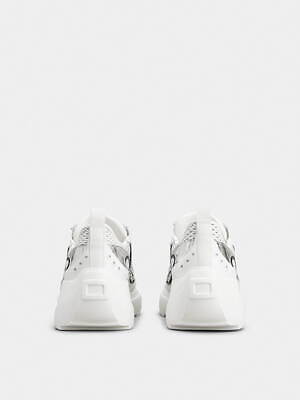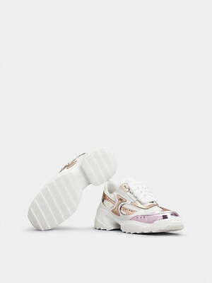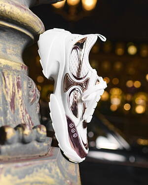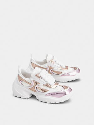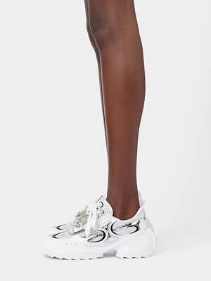 ナッパレザーと、メッシュ、ミラー加工ファブリックを組み合わせたアッパーに、取り外し可能なストラスバックルを加えたデザインは、カジュアルスタイルに女性らしさとリュクスな雰囲気をプラス。ラバーより軽量なEVA素材のラグ付きソールは、軽量かつ高いグリップ力を提供する。