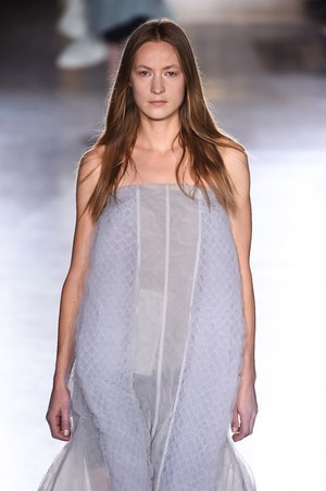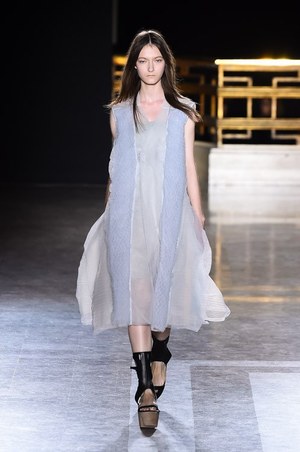 今季はいつもの構築性はそのままに、空気のような軽量感をもつドレススタイルが展開。透き通るほど薄い素材は、一見柔らかそうであるが、目を凝らすと幾重にもなり、しっかりとしたフォルムを象っている。肩からは幾何学的にプリーツされた生地がのせられ、幻想的かつ生命力のあるオーラが漂う。