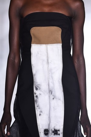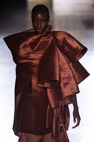 中盤より2ピースの着こなしが増え始め、中でも目を引いたのは折り紙のようなタートルネックだ。通常は柔らかに首を覆うはずだが、リックのアイテムはパリッとした立体感がある。デコルテからピンと伸びた生地、大胆にカットされた裾など、アート作品ともいえるような一着だ。そしてラストは軽い空気感をとっぱらい、筒の様な袖をアシンメトリーに配したボリューミーな服で締めくくった。