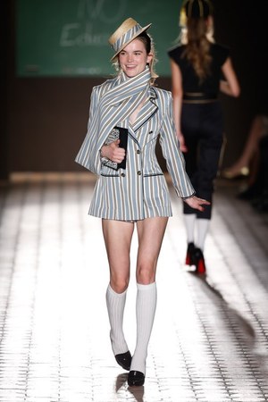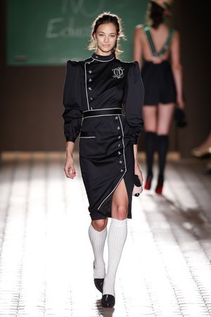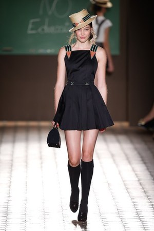 前半は、お勉強には欠かせない“鉛筆”がワンピースの肩紐やハットのリボン、ブラウスの襟、さらにスカート全体を飾ったアイテムがつづく。そこに現れたのは、パワーショルダーのブラックワンピースを纏った、ちょっぴり怖いセクシーティーチャー。ホワイトのパイピングが、シャープな印象をプラスした。