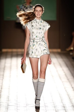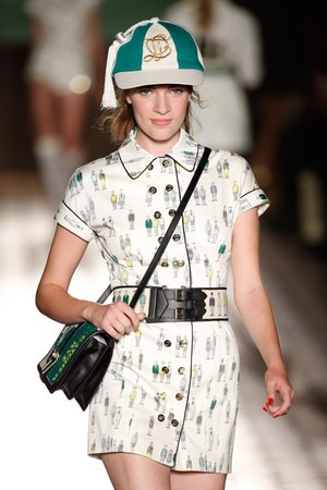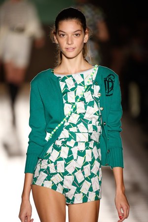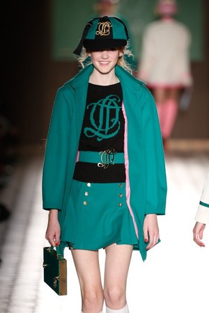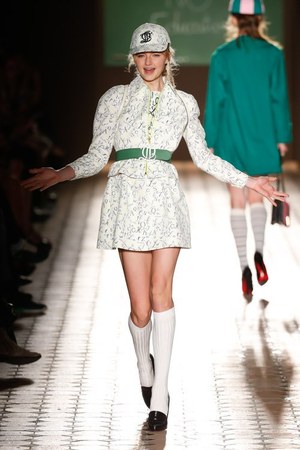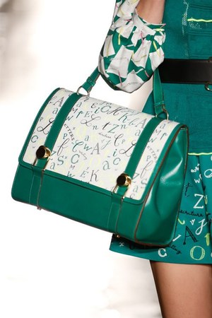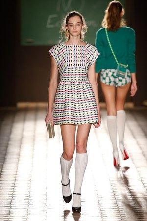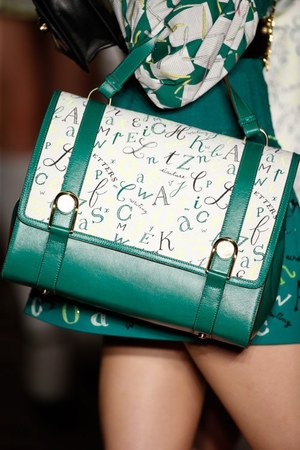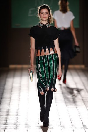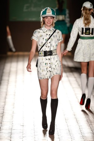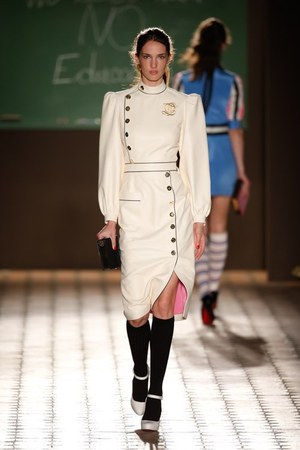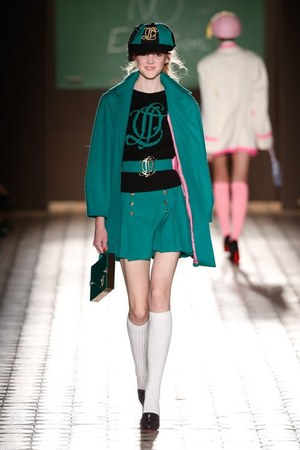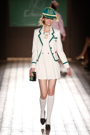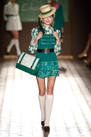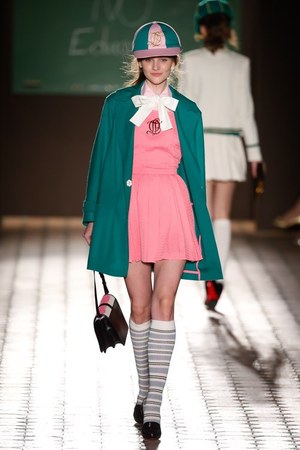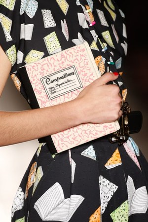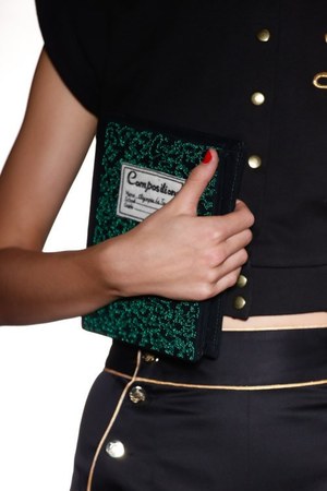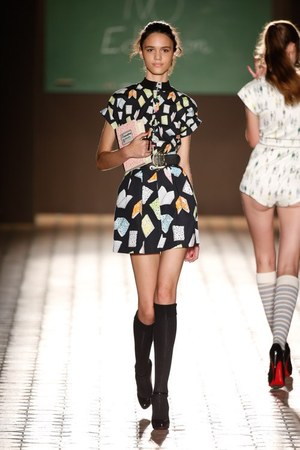 黒板を想起させるグリーンカラーのルックには、授業中に活躍する小物や英文字が散りばめられ、チャーミングな女学生を演出。本やノートのモチーフは、総柄プリントのワンピースやボリュームジャケット、ミニスカートなど、その後もランウェイを飾った。
