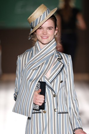 その後、ライトブルーとピンクのストライプ柄ツイードジャケットやショートパンツ、タイで構成したトラッドスタイルがステージを彩る。麦わら帽子やキャップなど、異なるテイストのヘッドアクセサリーを合わせ、エネルギッシュな子どもたちを表現した。