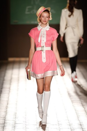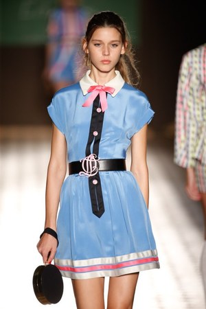 後半は、ピンクとライトブルーを中心としたスイートな世界に。まるで着せ替え人形のようなワンピースやホワイトシャツには、襟元やスカートの裾にリボンやストライプ柄のテープをあしらい、さらに可愛さをプラス。ショート丈のボトムスにハイソックスをあわせたコーディネートは、どこか懐かしさを感じさせた。