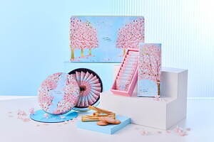 “満開の桜並木と青空”をさまざまな視点から描いたパッケージにも注目。10枚入りの細長い紙箱には芝生に座って見上げる桜を、24枚入りの丸缶には川の水面に舞う花びらを、「シガール」を追加した四角いアソート缶には横から眺める桜並木を描いた。