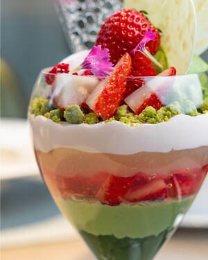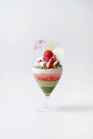 グラスの中には、"つるりとした”食感の抹茶ゼリー、さっぱりとした口当たりの柚子ジェル、抹茶クリームを重ねており、トップには、ほのかに塩味が効いた桜フロマージュソルベをはじめ、濃厚かつほろ苦い抹茶ジェラート、甘酸っぱい苺をデコレーションした。また、サクサクとした抹茶クランブルと軽やかに口どける苺シャンティを忍ばせ、食べ進めるほどに異なる味わいと食感、香りを楽しむことができる。