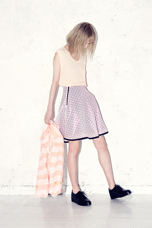 その他、少し艶感のある素材を使用したボトムや、メッシュのトップスなど、快活な表情を持つ洋服も見られる。今シーズンは、上質な素材使いと華やかなカラーを取り入れ、天真爛漫な女性にふさわしい洋服を提案した。