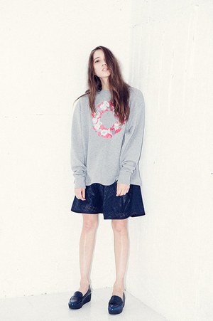 その他、膝丈のスカートやワンピースには波が渦巻いたような模様のメタリック加工レースを用いたり、プルオーバーにはバインダー加工と呼ばれる横縞が入った素材を使用したりと、こだわりを随所に散りばめている。さらにスウェットのトップスやブルゾンには、リースのような大判刺繍を施しポイントをプラス。