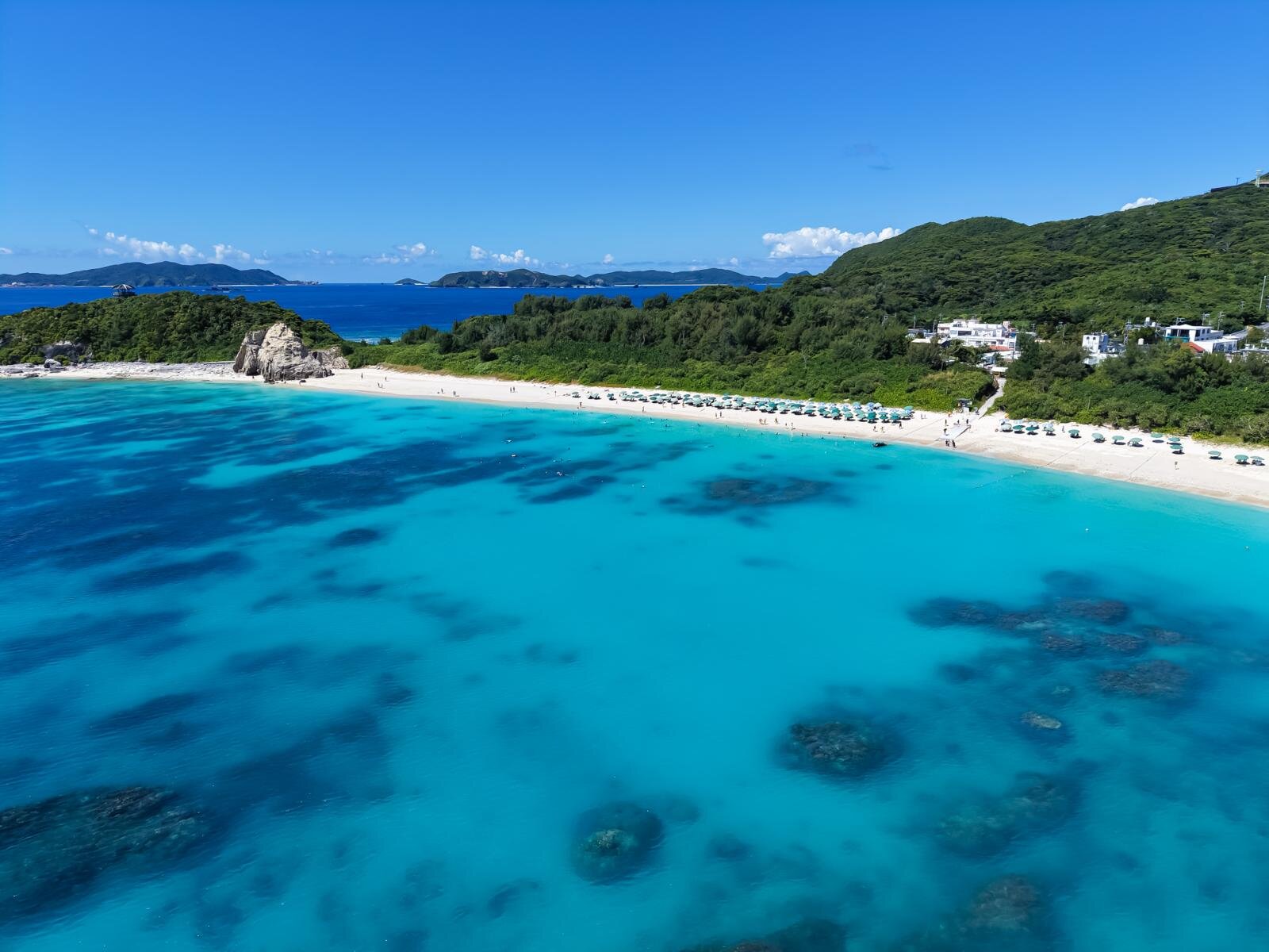 背景には自然豊かな山々が広がり、慶良間海峡展望所からこのビーチを見ると絶景。港から車・バスで約10分。