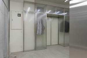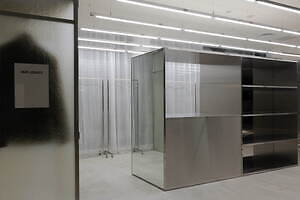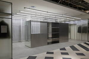 内装は、クリエイティブ・ディレクターであるクリストファー・ニイン監修のもと、対称性と素材のコントラストを軸に設計された空間。店舗中央には、ステンレススチール製のワンウェイミラーをはじめ、キャッシャーとフィッティングルームが配置されており、インダストリアルな雰囲気を演出している。