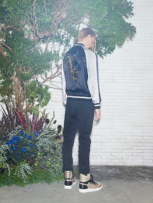 そんな音楽的なムードのコレクションだが、よく見るとそこに荒々しさはなく、意外にも繊細な魅力で満たされてることに気づく。スカジャンやブルゾン、セットアップなどに、素材として多用されたのはシルク。その光沢のある柔らかな素材は、蝶の動きをイメージしたゆとりのあるサイズ感と相まって、優雅に揺れる。ストリートの匂いの中で、儚さ、美しさを感じさせるコレクションとなった。