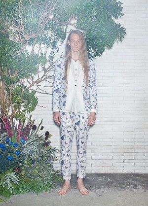 コレクションに触れたならまず、その理想郷には音楽が流れていることを体感するだろう。ロックなムードがしみ込んだ、総柄のセットアップやロングコート、バンダナ柄のパンツなどのアイテム。スカジャンの背面やセットアップの柄として用いられたグラフィックには、楽園を思わせる蝶や、華やかさと毒々しさを含んだバラとあわせて、音を奏でるサックスも描かれている。