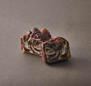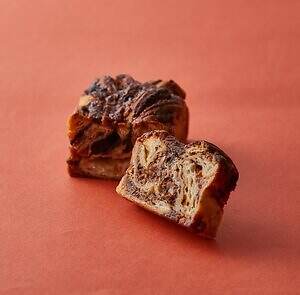 バブカ:「練り込み生地+巻き込み成形」ブリオッシュ系生地にチョコレートなどのフレーバーを厚く塗って巻き、縦割りしてねじって型を作り焼く。渦全体にフィリングが行き渡り、濃厚でしっとり。