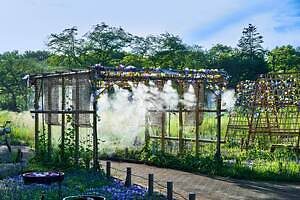 また、宿根草園では屏風をモチーフにした立体花壇や、涼しさを感じさせる瑞々しい花手水、睡蓮鉢などがミストとともに登場。夜間には立体花壇の足元を彩る花壇にブルーのライトやスポットライトが照らされ、普段見ることのできない花々の表情を楽しめる。さらに、朝顔のアーチには、蛍が舞っているかのような光の演出が施され、幻想的で非日常的な空間が生まれる。夏の草花が咲き誇る特別な空間で、ここでしか撮影できない写真を楽しんでほしい。