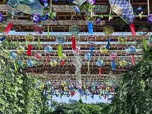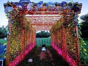 園路の両側には、夏の風物詩・朝顔で包まれた回廊を設置。夜には幻想的なライティングが施され、夢のような美しい景色が広がる。伝統的な要素と遊び心が融合した、涼しげな江戸の世界を体験できる。