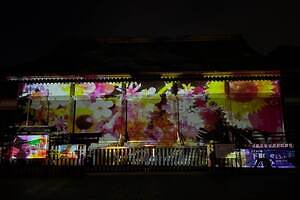 江戸東京たてもの園前の広場には、「朝顔」「花火」「風鈴」「水うちわ」といった江戸の夏を象徴するモチーフが登場。幻想的なライティングによって、遊び心あふれる江戸情緒が演出される。また、広場正面の江戸東京たてもの園ビジターセンター(旧光華殿)では、色鮮やかな花のプロジェクションマッピングを実施。イベント案内板に設置されたQRコードをスマートフォンのカメラで読み込めば、画面上にAR花火が音を立てて華やかに打ちあがる。