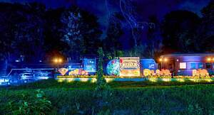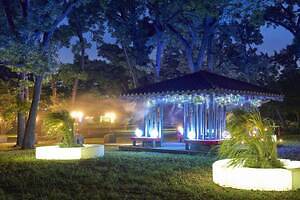 文明開化により、和と洋の文化が交差した明治時代をテーマにしたエリアも登場。東屋には、天井いっぱいに咲き誇る花々と、レトロなステンドグラス、ほのかな灯りのガス灯をイメージした照明、さらにふわりと漂う蛍のような光を設置。夏の夜、心地よいミストとともに明治の浪漫を感じながら、ゆったりとしたひとときを過ごしてみてはいかがだろうか。